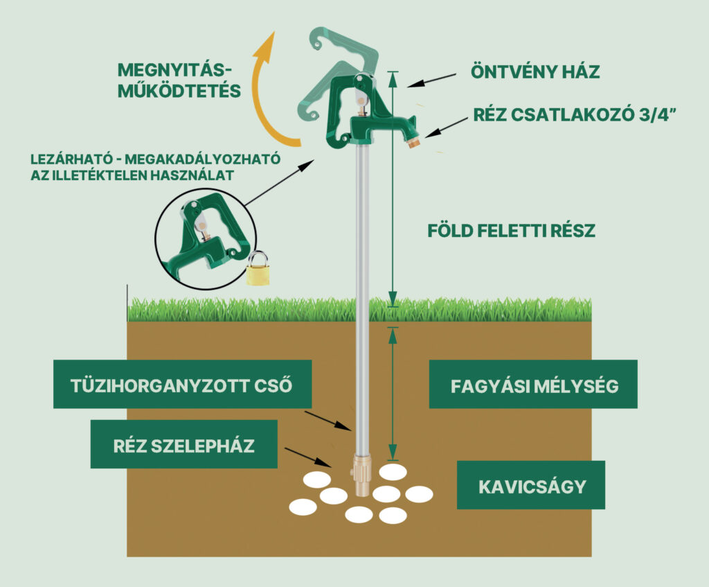Minden használat után, elzáráskor a föld feletti részről a víz visszafolyik a föld alá és így a csőbe nem fagy bele.